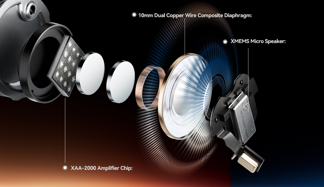 For the mids and highs, Air5 Pro+ adopts the xMEMS “Cowell” driver, powered by a specially designed XAA-2000 Aptos high-efficiency amplifier IC, delivering sound that’s delicately detailed and remarkably precise. For the lows, a 10 mm dynamic driver featuring a PU + PEEK composite diaphragm with dual copper wiring inside brings deep, rich bass that transcends the limits of conventional in-ear designs.