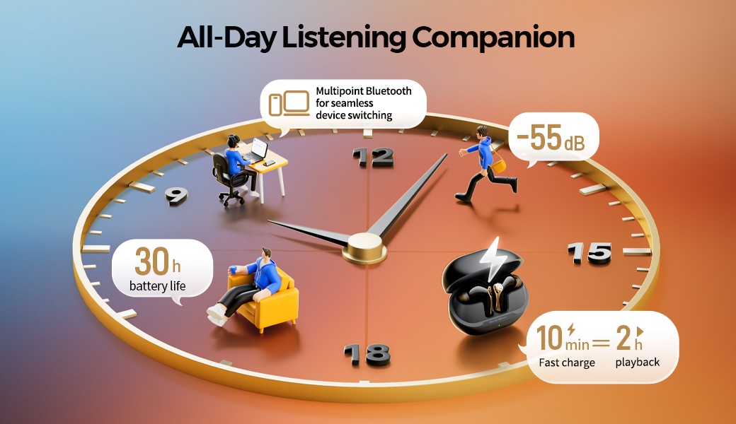With a maximum reduction of up to 55dB, this is the most powerful ANC ever in a SOUNDPEATS TWS, delivering a new era of silence and comfort — perfectly balanced by AI.
