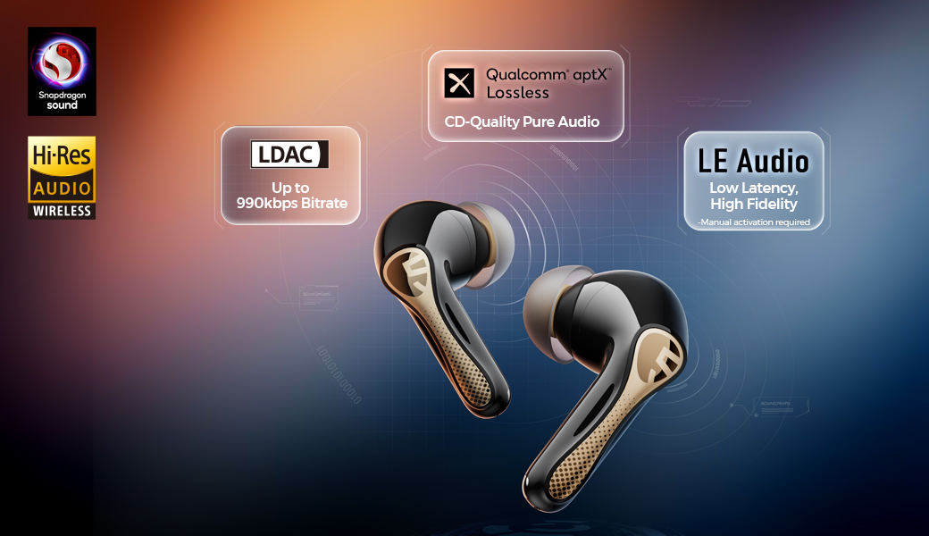 Air5 Pro+ supports the full suite of next-generation audio codecs for a truly high-fidelity wireless experience. It delivers Hi-Res playback up to 96kHz/24bit via aptX Adaptive, and CD-quality 44.1kHz/16bit lossless audio through aptX Lossless. In addition, it supports LDAC, renowned for its premium sound quality, and LC3, the low-latency, high-efficiency codec adopted in the latest Bluetooth audio standard. With every major high-quality codec onboard, Air5 Pro+ sets a new standard for wireless audio.