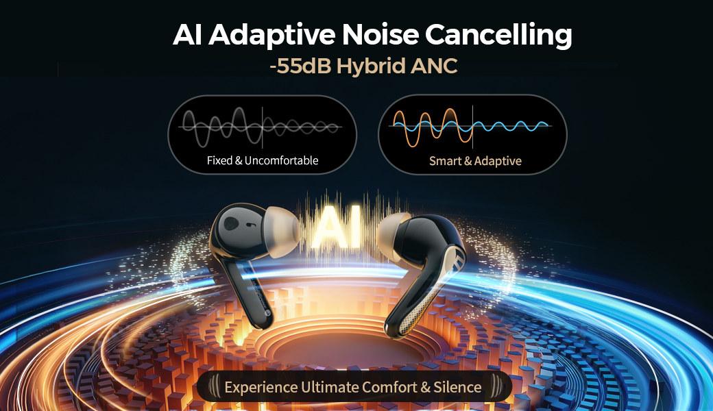 AI Adaptive ANC — Up to 55dB Noise Reduction